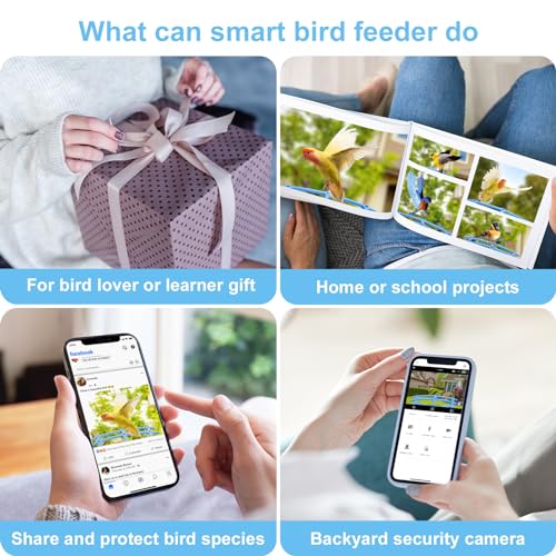 【Share with Everyone】 Bird feeder builts in 64GB TF card(3-day loop saving) and free 30 day cloud storage (with monthly subscription support). You can save photos and videos of your birds in the app and organize them into beautiful photo albums for home or school projects. You can share bird videos or funny things on social media and discuss with bird lovers. Or share with your family and friend, so you are connected by the sharing.