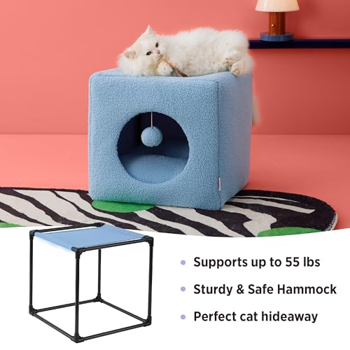 Elegantly Sturdy: Crafted with a robust steel tube structure, our Sherpa Cat Cube combines durability with flair. Its chic, cozy, and cute design seamlessly integrates into any room, be it your living room, bedroom, office, or garage. Our signature non-slip bottom keeps the cube securely in place, providing a stable and safe spot for your cat to rest, play, and relax. Plus, the added inner hammock on top ensures stable support for cats up to 55 lbs to leap and frolic freely.