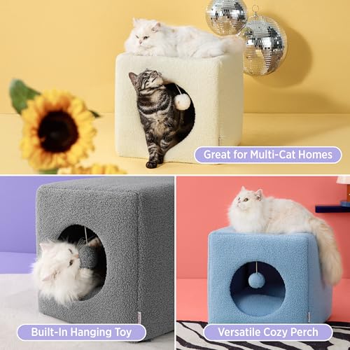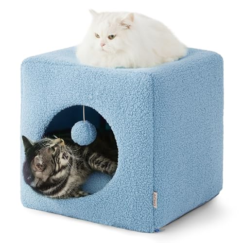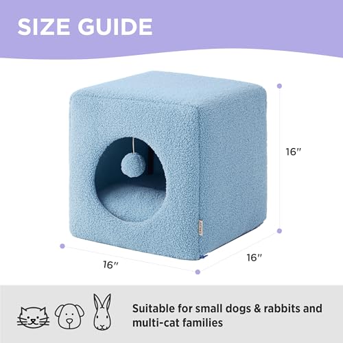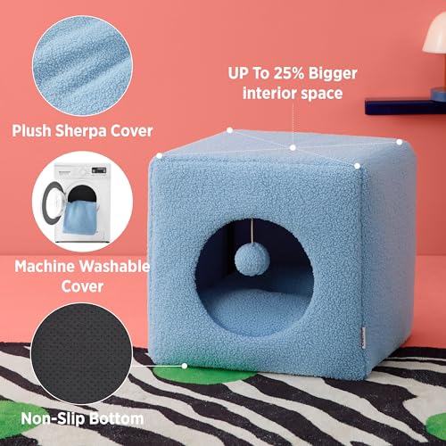 Lesure Cat Bed for Indoor Cats – Fluffy Large Cat House for Kitten and Small Pet, Enclosed Cat Cave with Removable Washable Sherpa Cover, Cute Cat Hideaway with Non-Slip Bottom, 16″ x 16″ x 16″, Blue