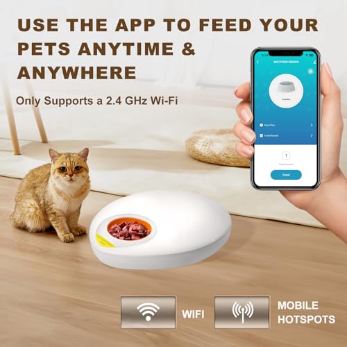 【Convenient WiFi App Control】The App Tuya, is a safe mature smart home control terminal, no need to worry about your privacy. The WiFi allows you to feed your pets anytime and anywhere, and you can track feeding records effortlessly. Share the device with multiple accounts for added convenience. Note that the feeder only supports 2.4GHz network.