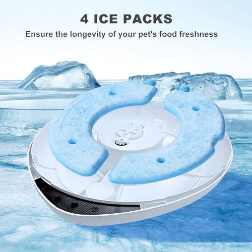 【Freshness Ensured with Ice Packs】Ensure the longevity of your pet’s food freshness, our innovative pet feeder equipped with four ice packs. Positioned at the container’s base, ice pack guarantees 6-8 hours of cooling effect. The refrozenable ice pack also ensuring that the food will not be too cold, temperature control at 5-13 degrees Celsius. No more worry about the burden of food too cold on the cat’s stomach.